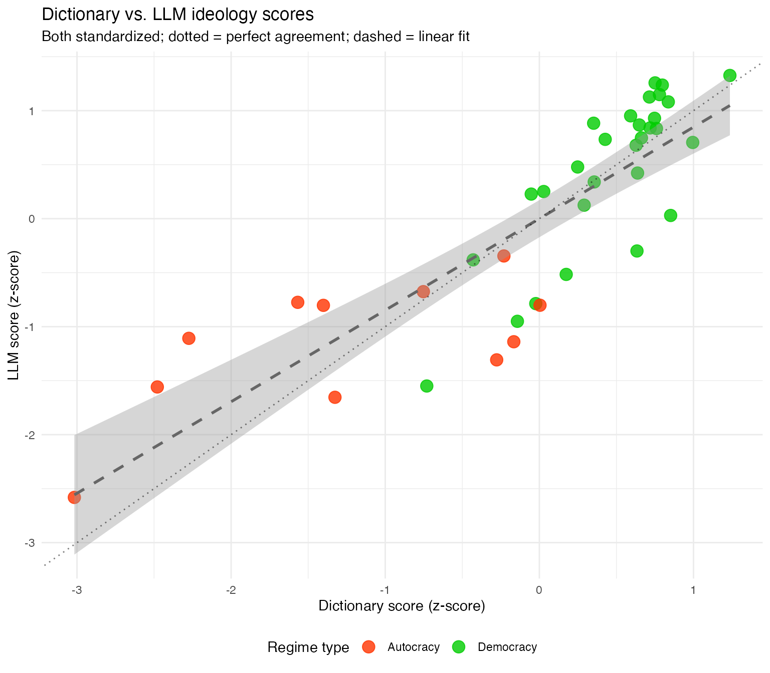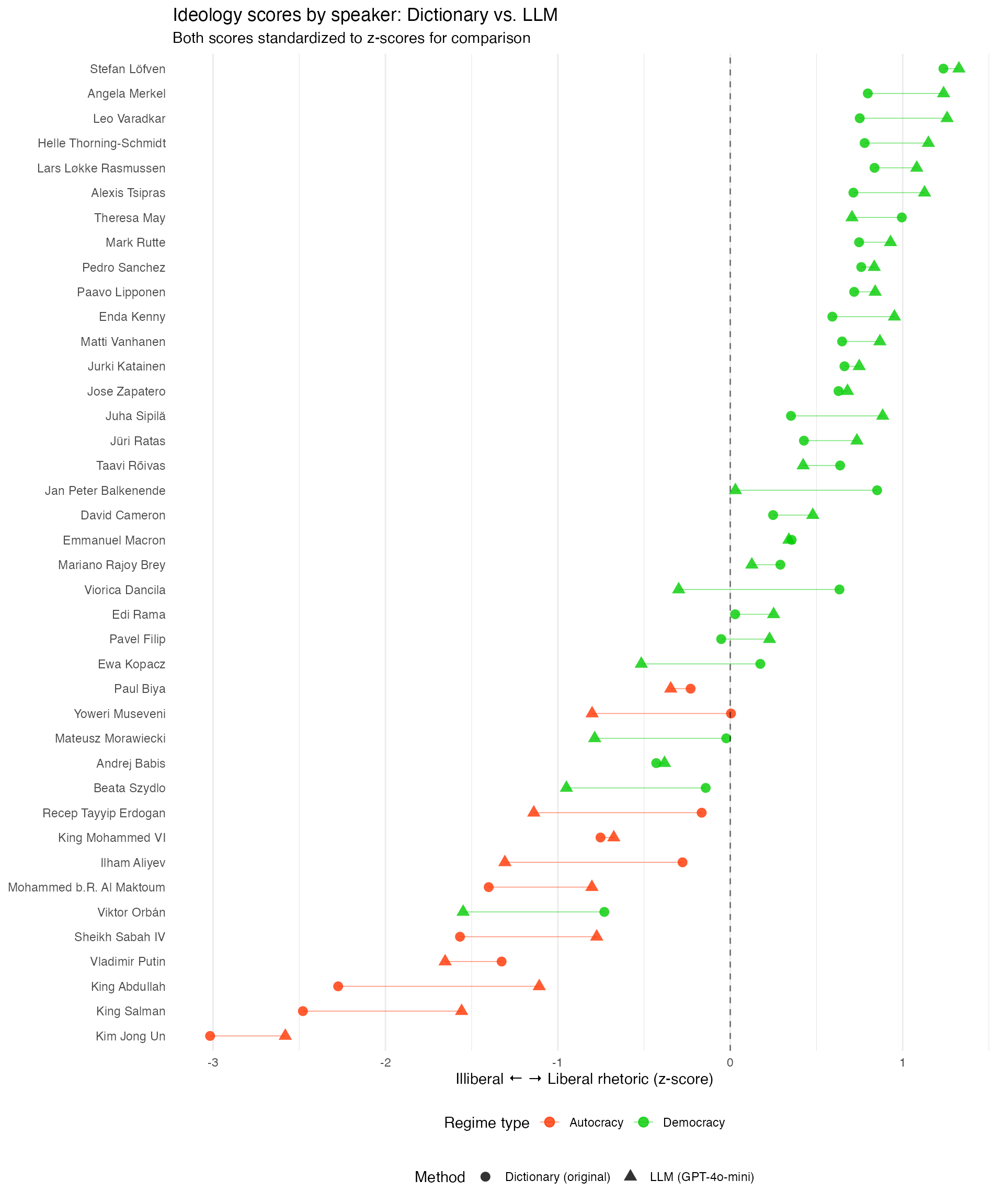 The scatter plot shows the relationship between the two scoring methods at the speaker level. Points close to the dotted diagonal line indicate strong agreement between methods. The color separation confirms the original study’s finding: autocratic leaders (red) cluster toward the illiberal end, while democratic leaders (green) tend toward more liberal rhetoric.